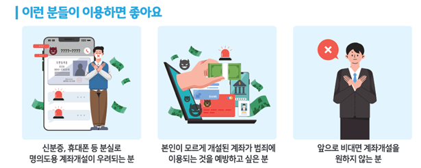 내 명의로 무단으로 개설되는 비대면 수시입출식 계좌를 사전에 막아주는 기능을 제공합니다.