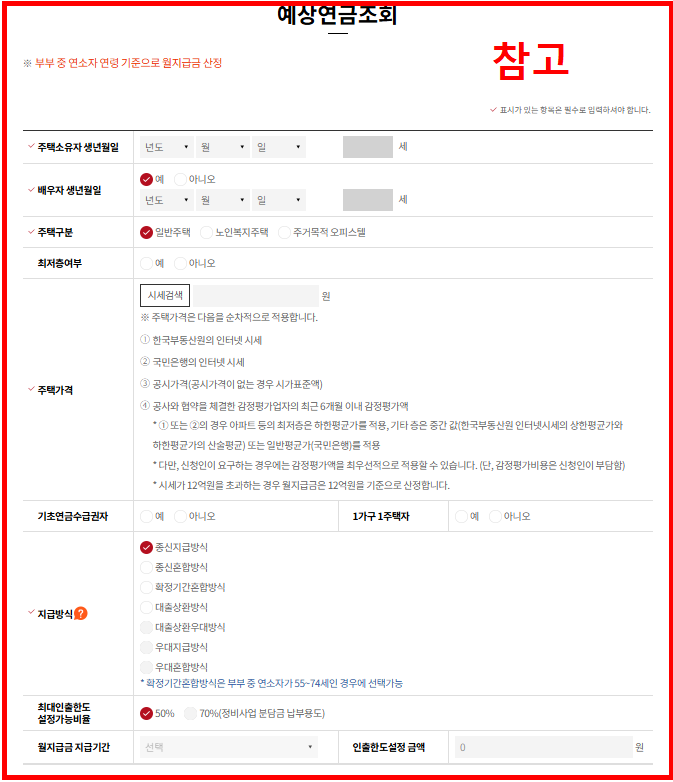 - 수령 방식 (종신형, 기간형, 대출형 등)