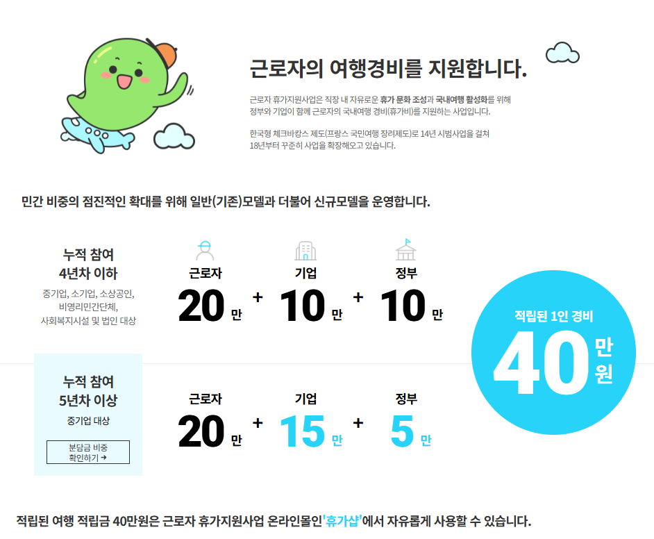 정부+기업+근로자 3자가 함께 여행 경비를 모아서 국내여행을 지원하는 제도예요.